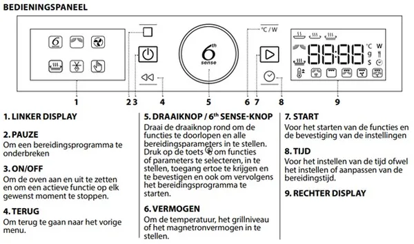 - Druk op de ON/OFF knop (3) om de magnetron aan te zetten. Draai aan de ronde knop (5), selecteer het handje en bevestig door op de ronde knop te drukken.