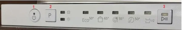 - Plaats een vaatwastablet in de deur en zet de vaatwasser aan (1).